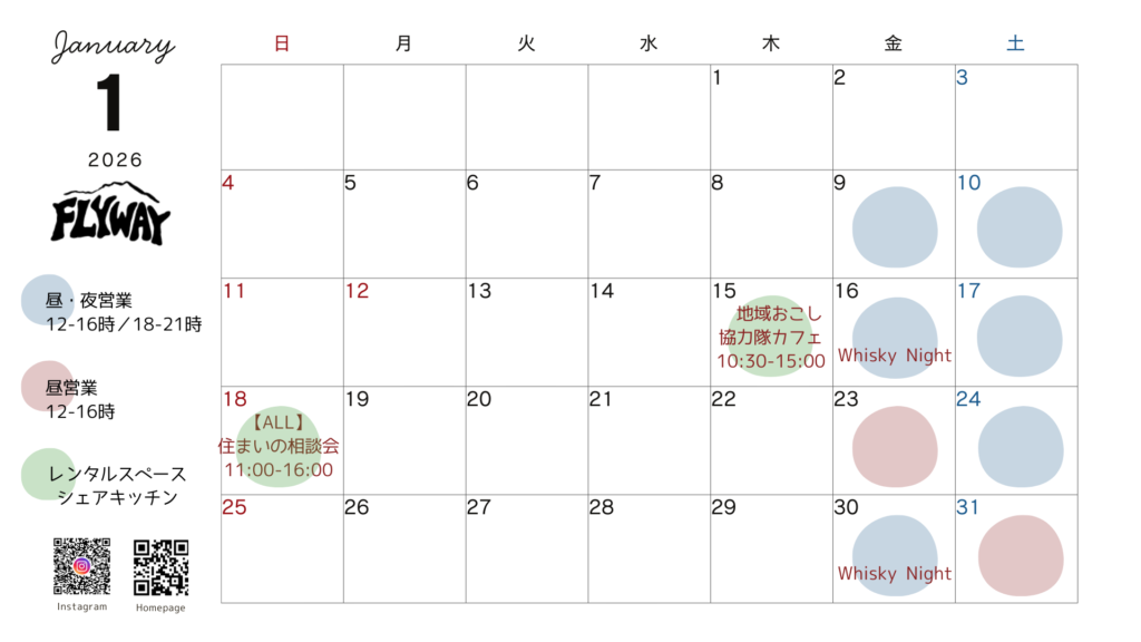 2026年もよろしくお願いいたします。1月の営業カレンダーをアップしました。