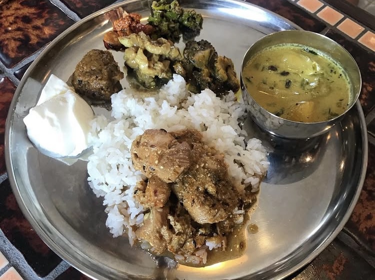 - 魚(鱈のミーンコランプ)/肉(チェティナードチキン)/野菜(大根と人参のサンバル)/野菜(ヤーコンのボリヤル)/野菜(白菜のクートゥー)/漬物(レモンアチャールとガーリックアチャール)/ヨーグルト(リンゴのライタ)/米(バスマティライス)